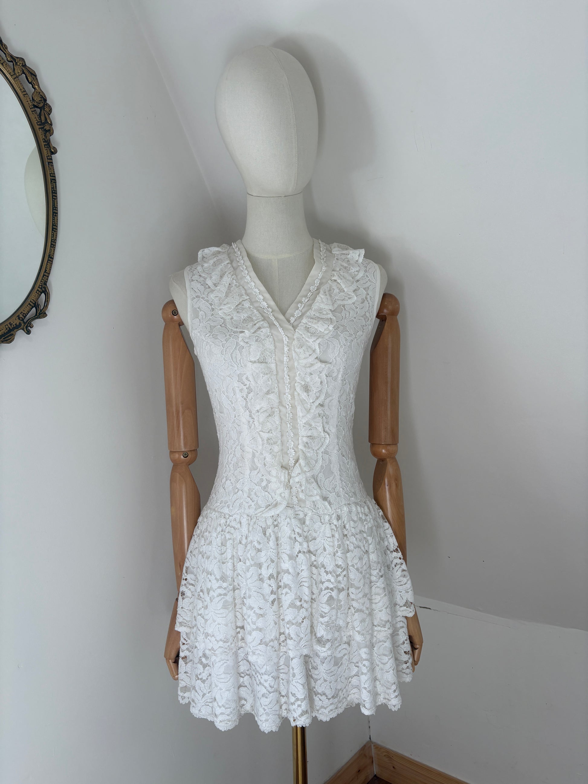 Amazing babydoll dress designed by Twiggy and her team. 30’s inspired drop waist which was very trendy in the mid sixties. Perfect for a second wedding dress!