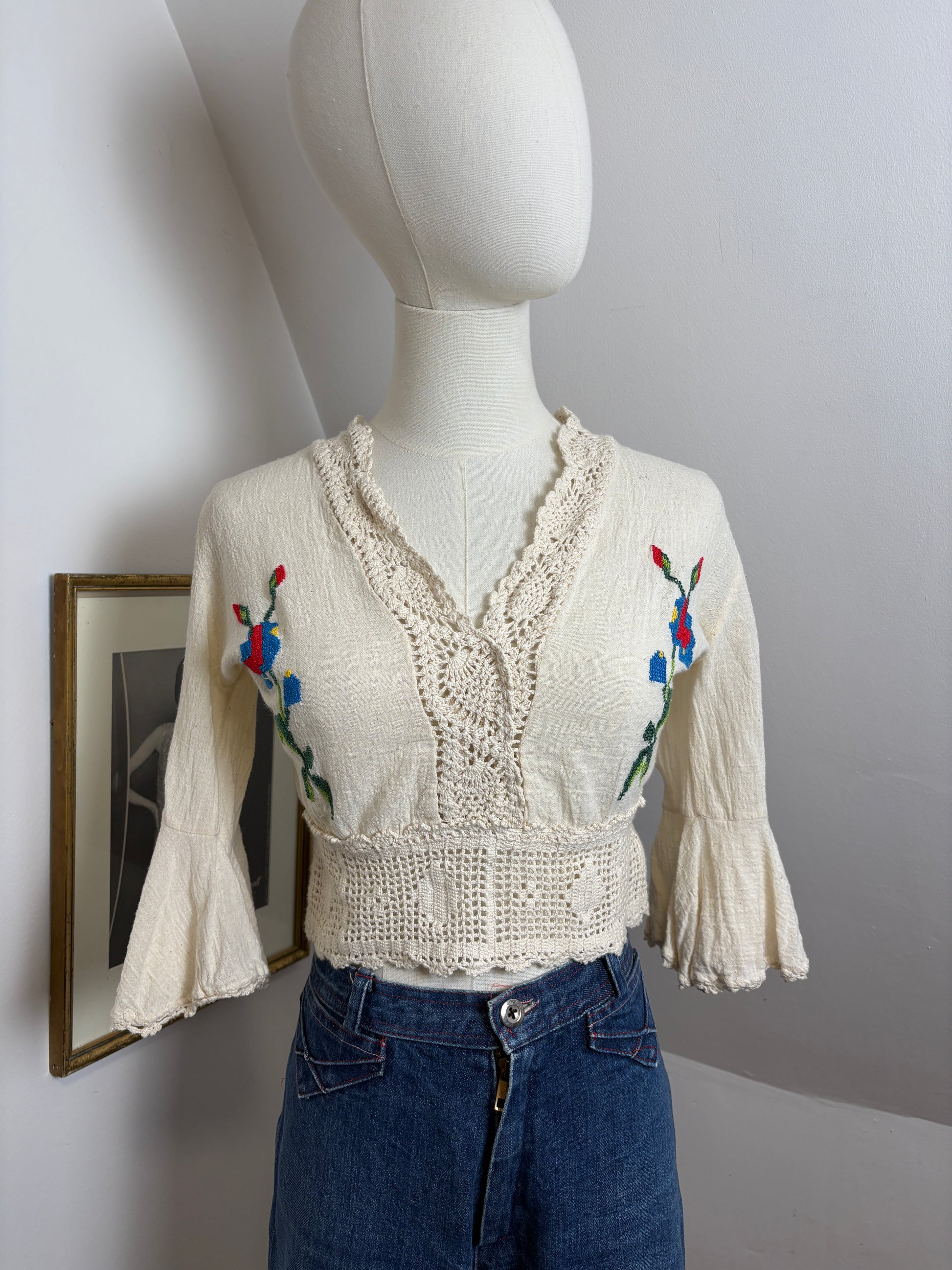 Beautiful floral embroidery on the chest, and mid length trumpet sleeves! A special piece. Has a slit up the back.