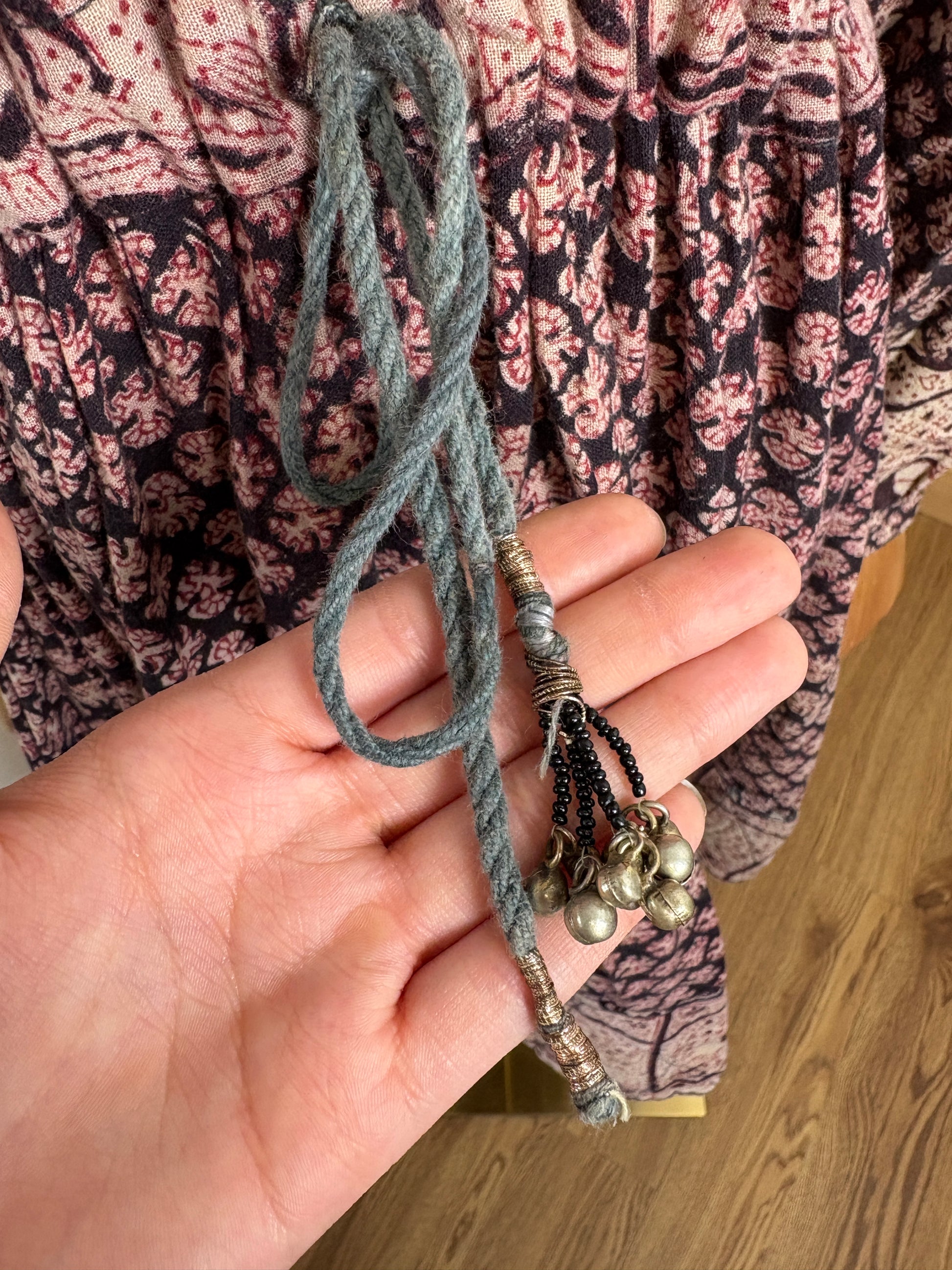 In good vintage condition, the bells have fallen off on one of the strings. Drawstring waist and quilted hem. Beautiful classic blockprint fabric!