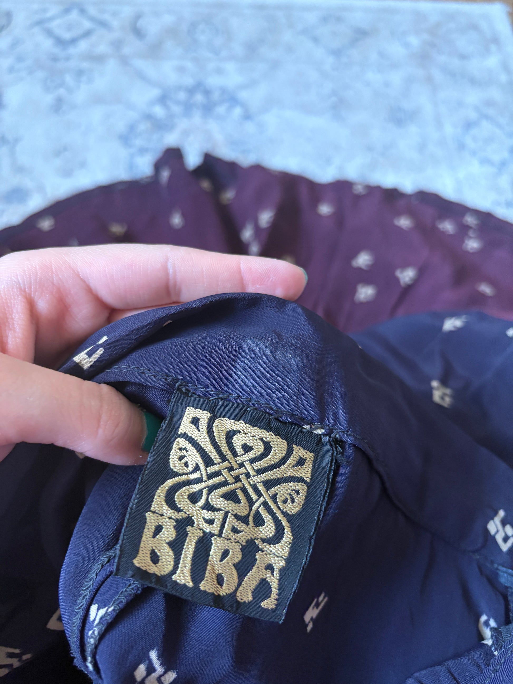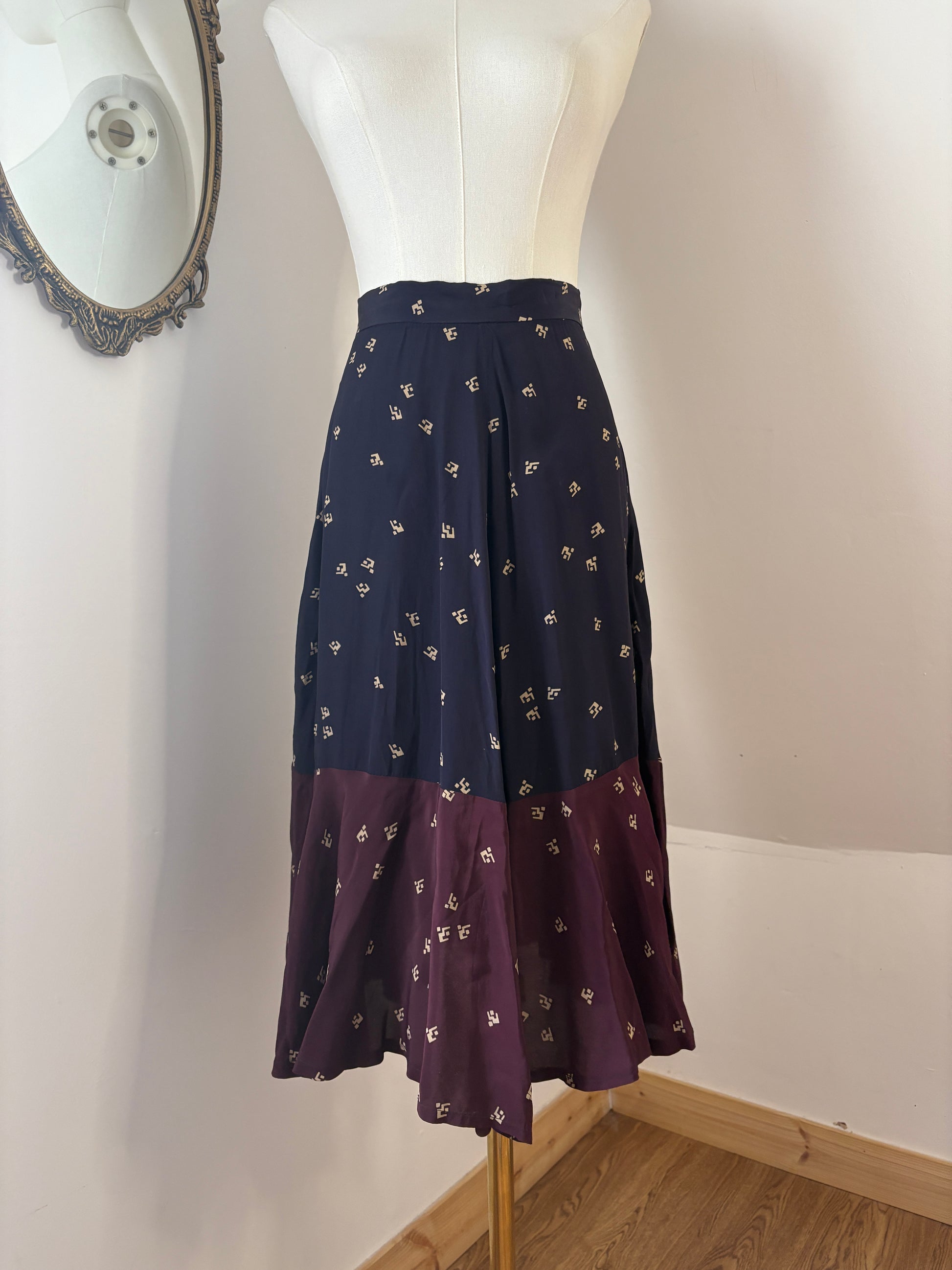 1970s Biba Art Deco Skirt, made from a silk crepe material, in a two tone colourway. Gorgeous 30s inspired piece by Biba. This pattern can be seen in dress form also, and in different colour ways. My guess for an exact date would be around 1972.