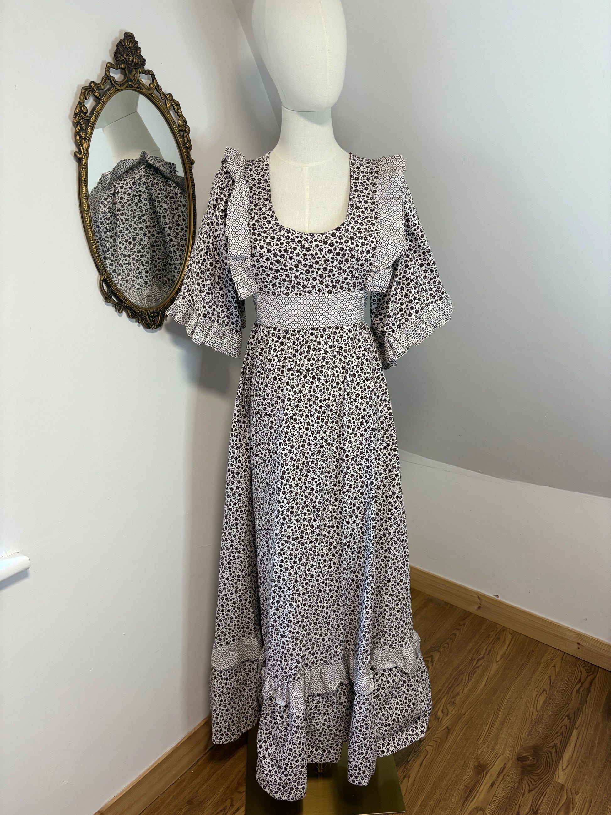 1970s Gina Fratini Prairie Dress, made from 100% cotton. Label reads ‘Fratini Designs’.